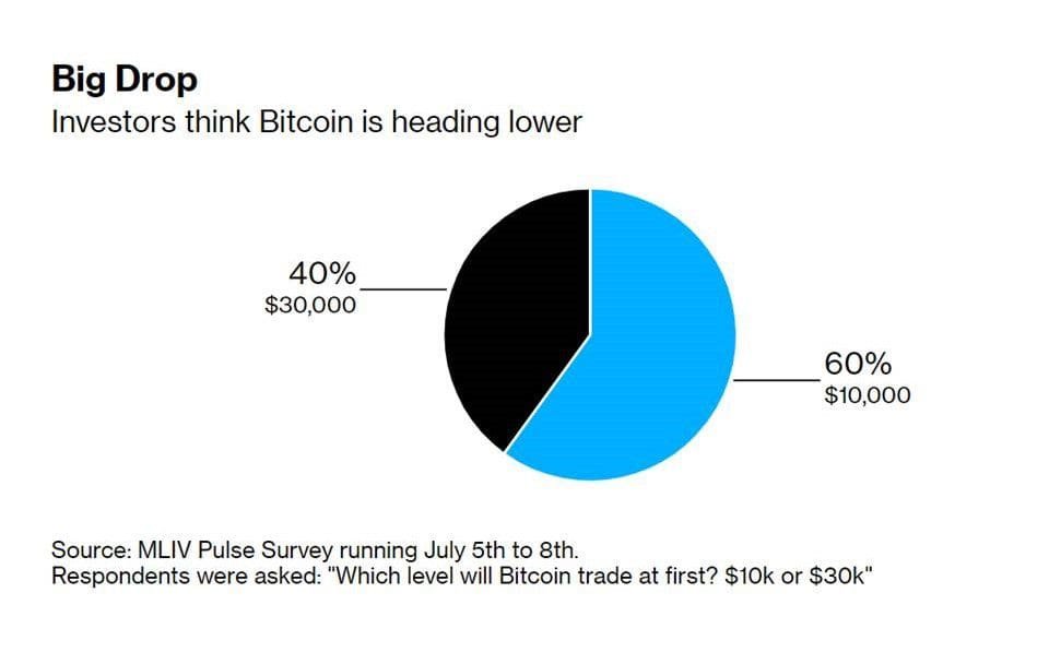 The “MLIV Pulse” survey of 950 investors found that 60% believe the Bitcoin market will likely crash another 50%. In contrast, only 40% claimed it would rally by 50% to reach the $30,000 levels, Bloomberg reported.
