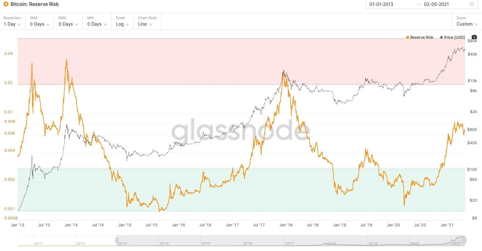 Reserve Risk is a cyclical indicator. It tracks risk-reward balance relative to the confidence and conviction of long-term holders. When confidence is high, and the price is low, the risk/reward comes for investment. An opposite case with the high price and low confidence indicates an opposite attraction, and buying is not recommended at this point.
