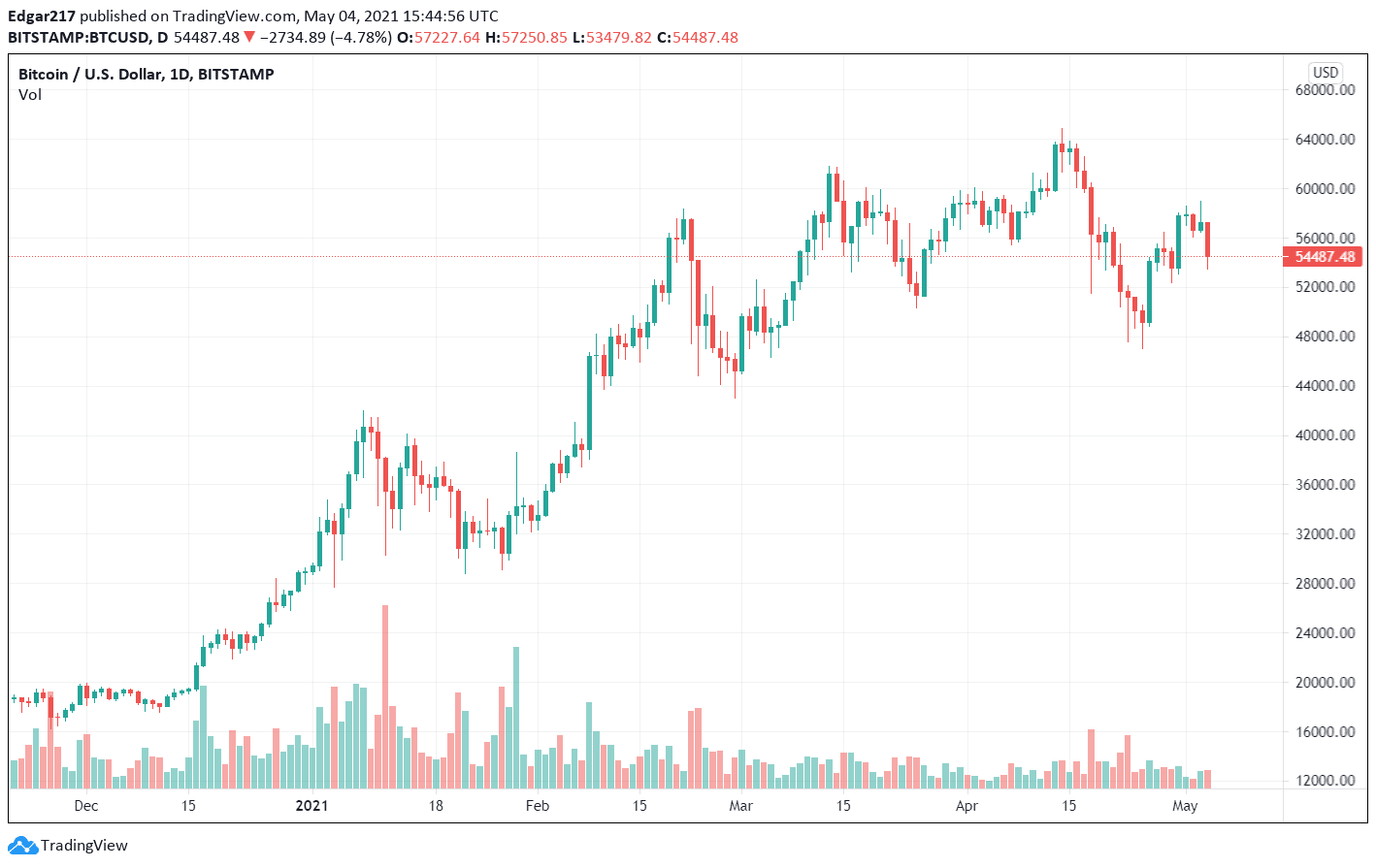 Yerevan (CoinChapter.com) — As Bitcoin returns to lower levels after establishing a record high near $65,000, speculations about its bullish exhaustion are rising. Now trading around $56,000, the flagship cryptocurrency is losing its market share to rivaling crypto assets, including Ethereum, which rose more than 16 percent on Tuesday.