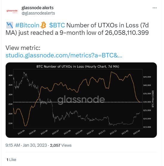 Additionally, according to another Glassnode tweet, the number of addresses in loss reached a 9-month low due to the recent price surge. However, the metrics could also signal a growing number of new wallets that purchased BTC during the ‘plateau’ period Nov-Dec, 2022.