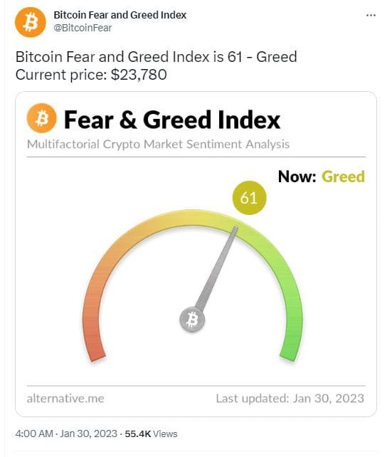 The Bitcoin “fear and greed” index stood at 61 on Jan 30, pointing to an ongoing “greed” phase. In detail, the index generates a number between 0 to 100.