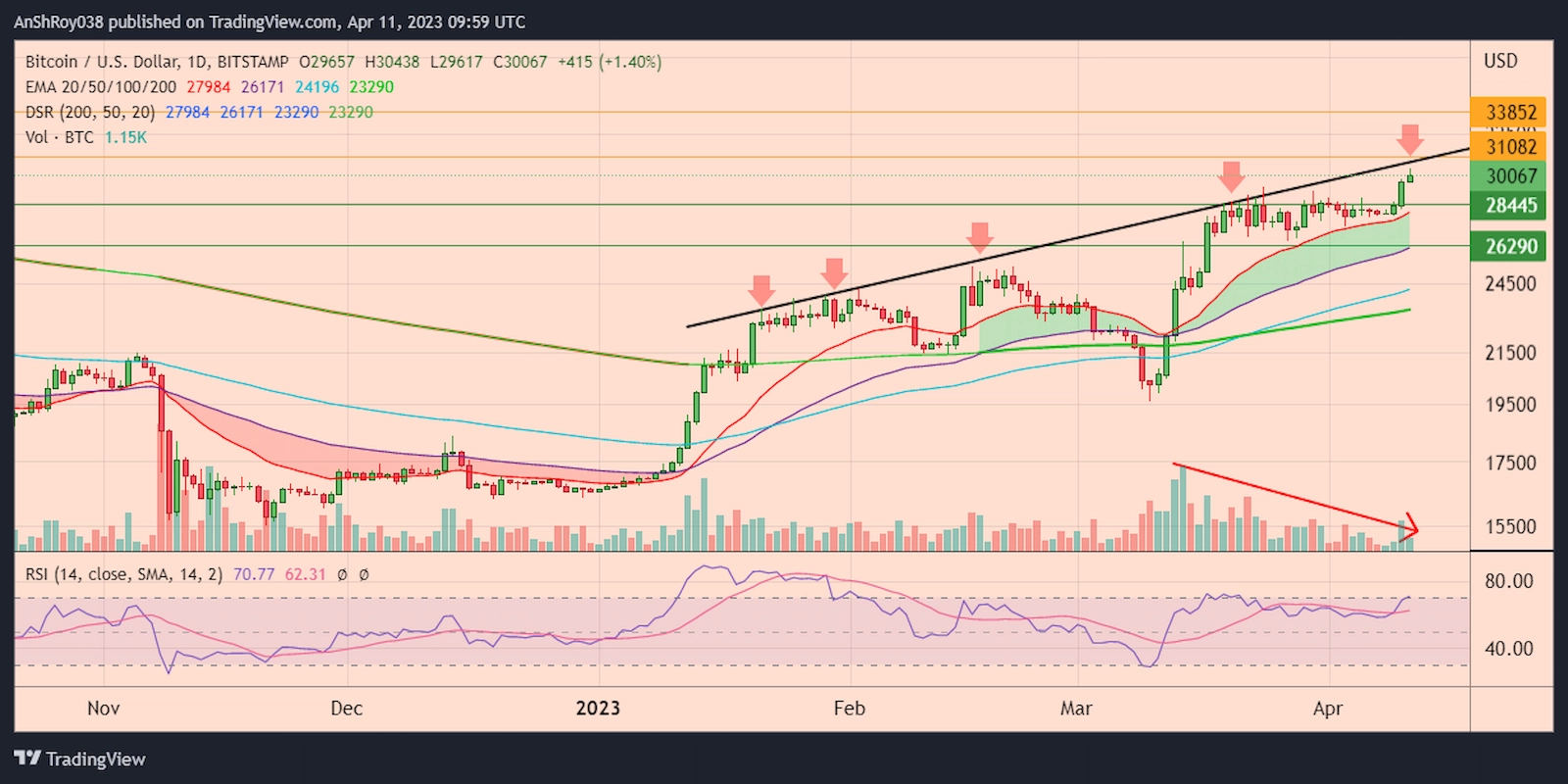 Though BTC price rose above $30,000 on April 11, bears made their presence felt near a multi-month ascending trendline resistance. Furthermore, Bitcoin’s daily trading volumes have declined steadily since March 14.