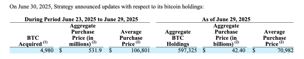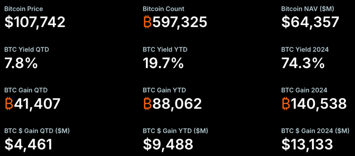 Over the course of the week, BTC jumped from around $101,000 to over $108,000, with Strategy scooping up its latest coins at an average price of $106,801 each. With this addition, the company now holds a staggering 597,325 BTC. That brings its total acquisition cost to roughly $42.4 billion, with an average purchase price of $70,982 per coin.