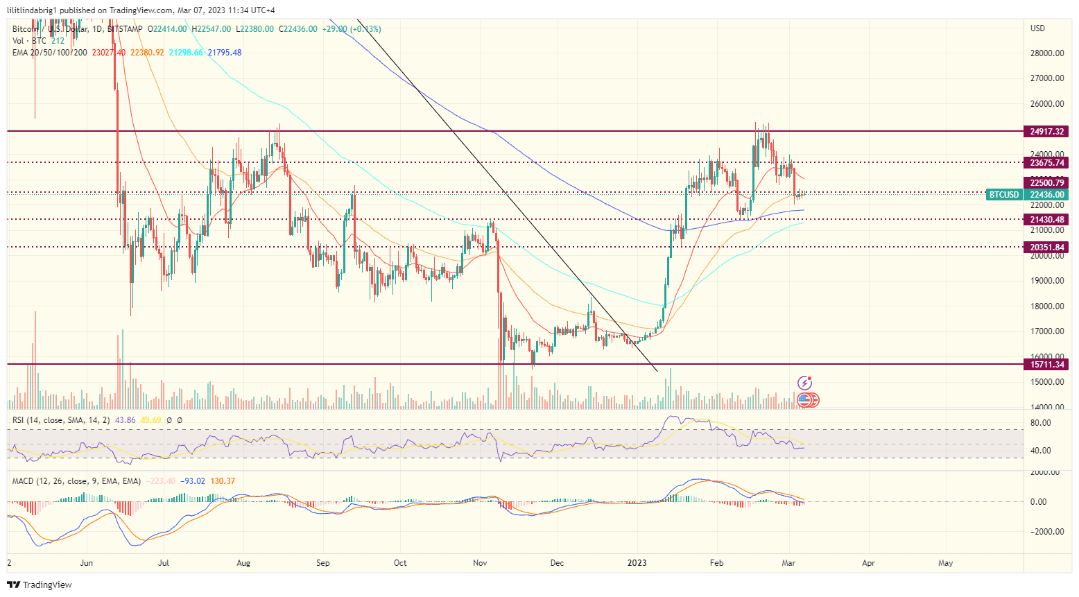 YEREVAN (CoinChapter.com) – Bitcoin partially pared its year-to-date gains, dropping 10% since peaking at $25,000 on Feb 22. As a result, the flagship crypto stood at just over $22,400 on March 7, after stalling at the said level for three previous days.