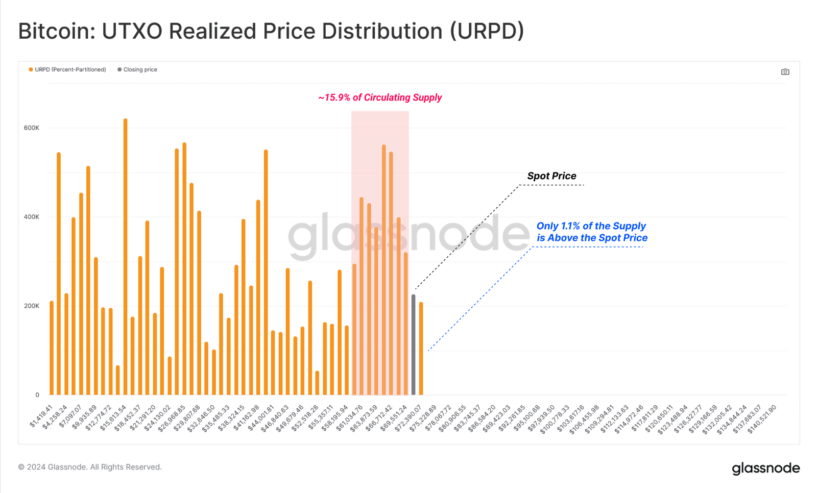 In contrast, a mere 1.1% of supply is being held at higher cost bases, implying little resistance to higher price levels. This supply imbalance strongly favors bitcoin’s price discovery heading higher.