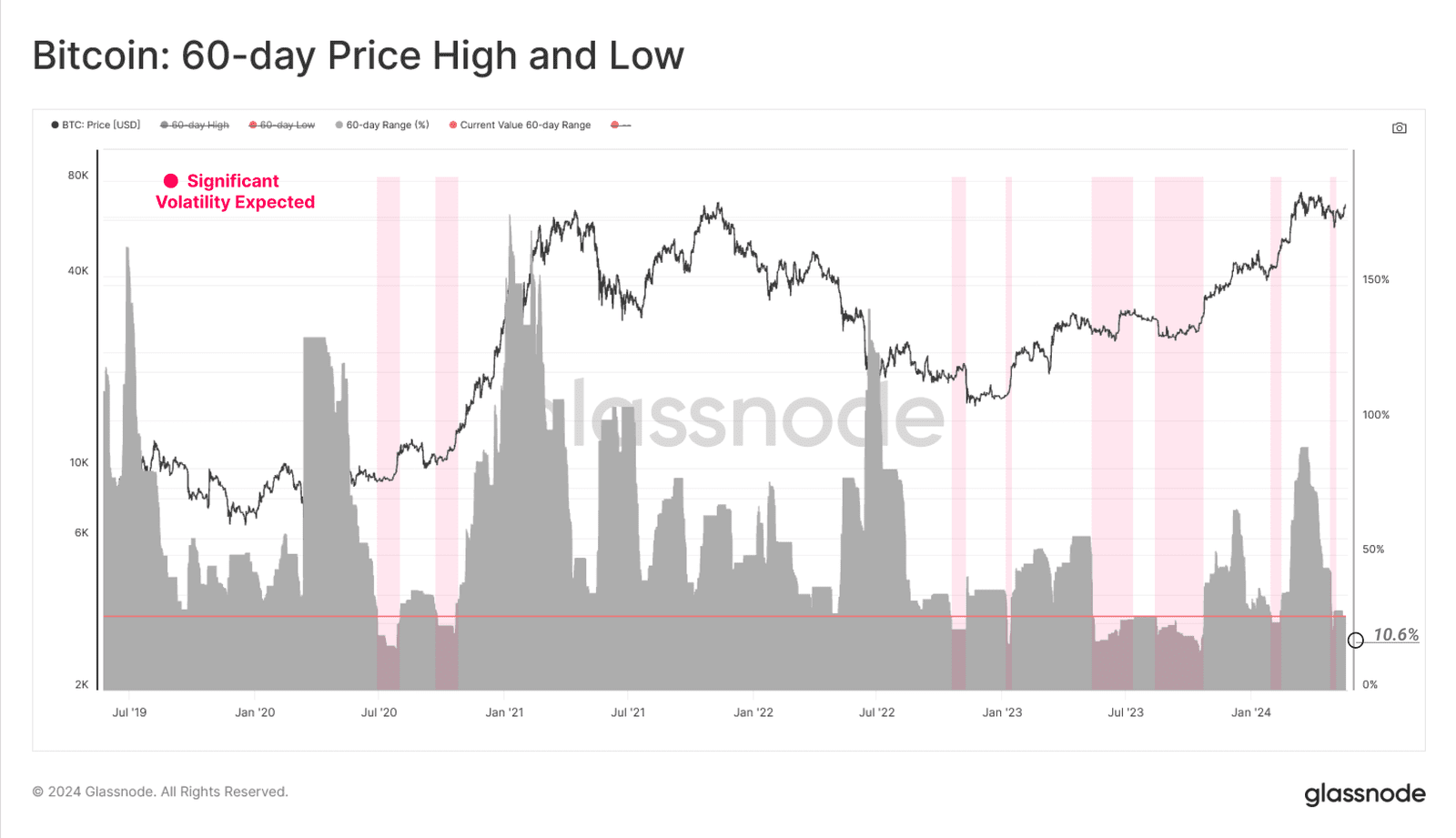 Bitcoin’s volatility is also at multi-year lows when measured by the percentage price range over 60 days. Such prolonged periods of volatility compression have historically preceded explosive price moves.