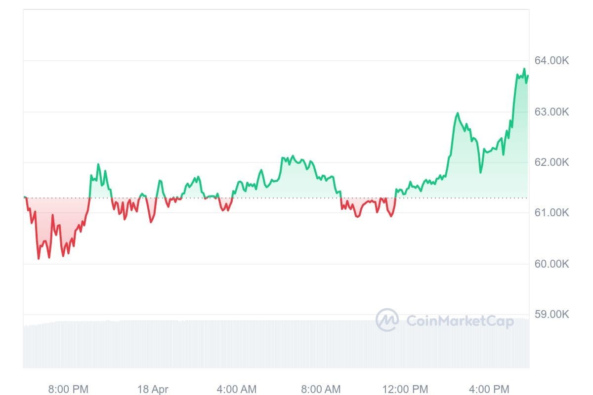 NAIROBI (Coinchapter.com) – Bitcoin’s parabolic trajectory started today, trading at $63,700.67 after briefly dipping below $60,000 the day before. This volatility aligns with the anticipation of a key blockchain event – the Bitcoin halving on April 20, 2024, at 03:33 UTC. Halvings historically impact price movements by reducing the rate at which new bitcoins enter circulation, affecting supply dynamics.