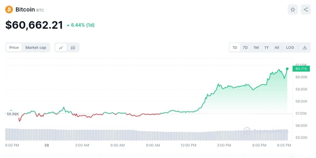 Despite the minor pullback, on-chain data and overall market sentiment remain bullish. At this time, Bitcoin’s price is above $60,662, marking a 6.44% gain over the last 24 hours.