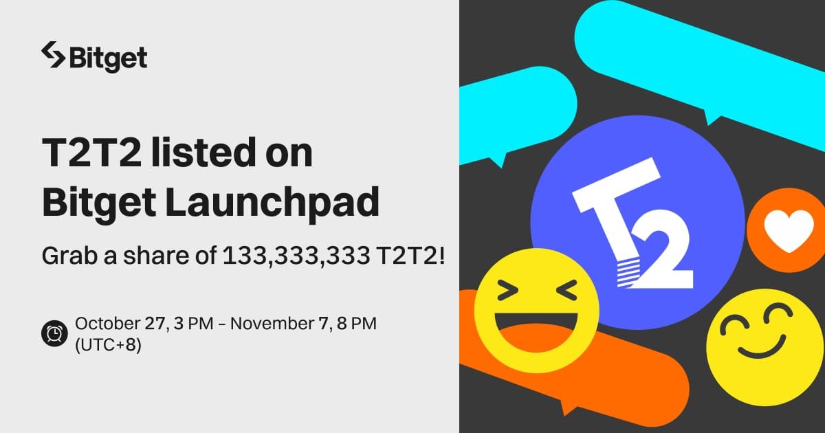 T2T2, a cutting-edge project in the decentralized finance (DeFi) space, will be listed on Bitget’s Launchpad on October 27, 2023. The launchpad event will consist of several phases, including the commitment period, holding calculation period, and distribution of T2T2 tokens.