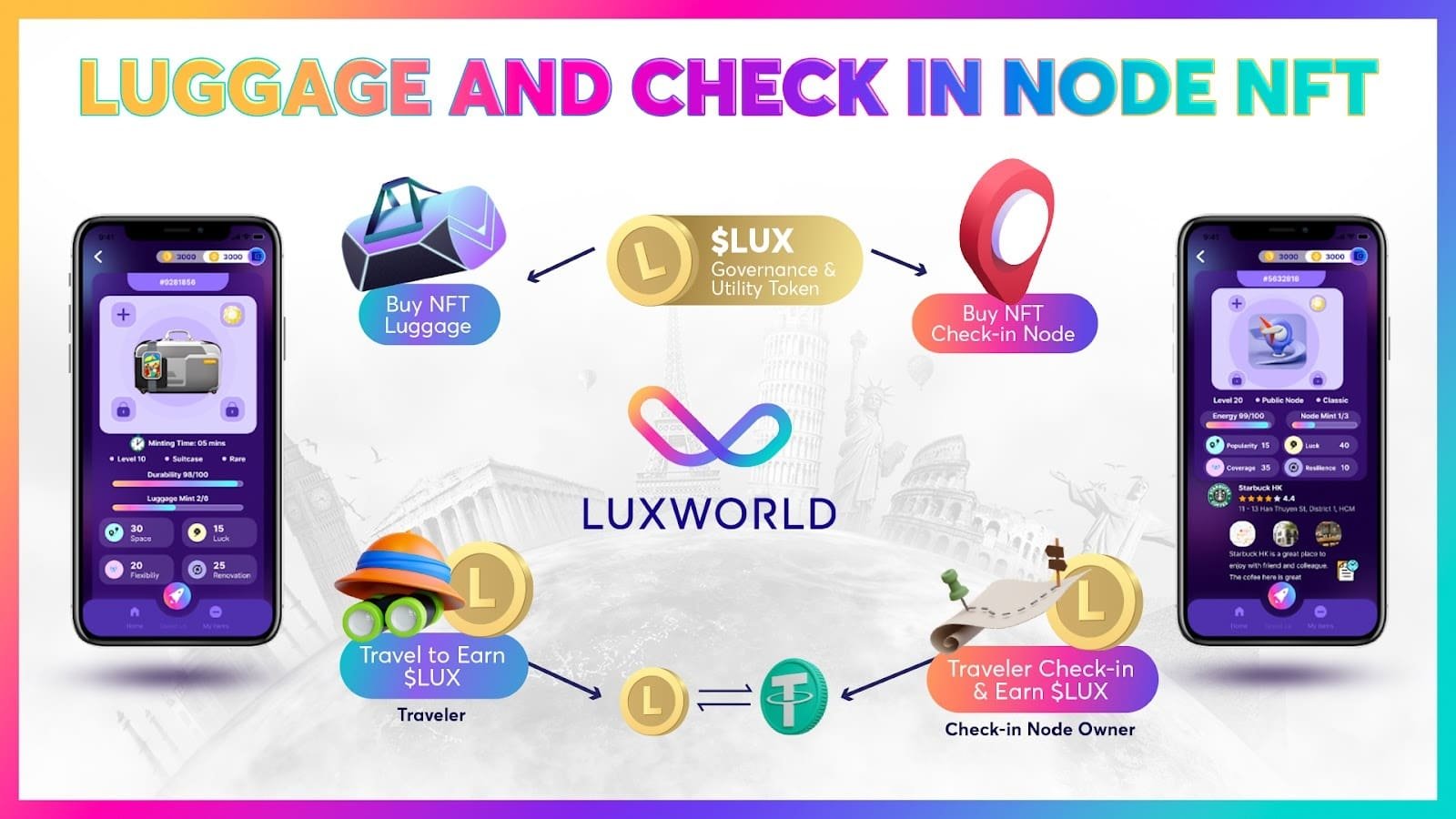 With 2 types of NFT: Luggage NFT or Check-in Node NFT, the users can choose to be a Traveler, a Check-in Node Owner, or BOTH. Only by using Luggage NFT, users make a nice profit while still enjoying their trip to the fullest. With the wonderful Check-in Node NFT, you can leave your mark in an incredible virtual environment and earn a limitless amount of money.