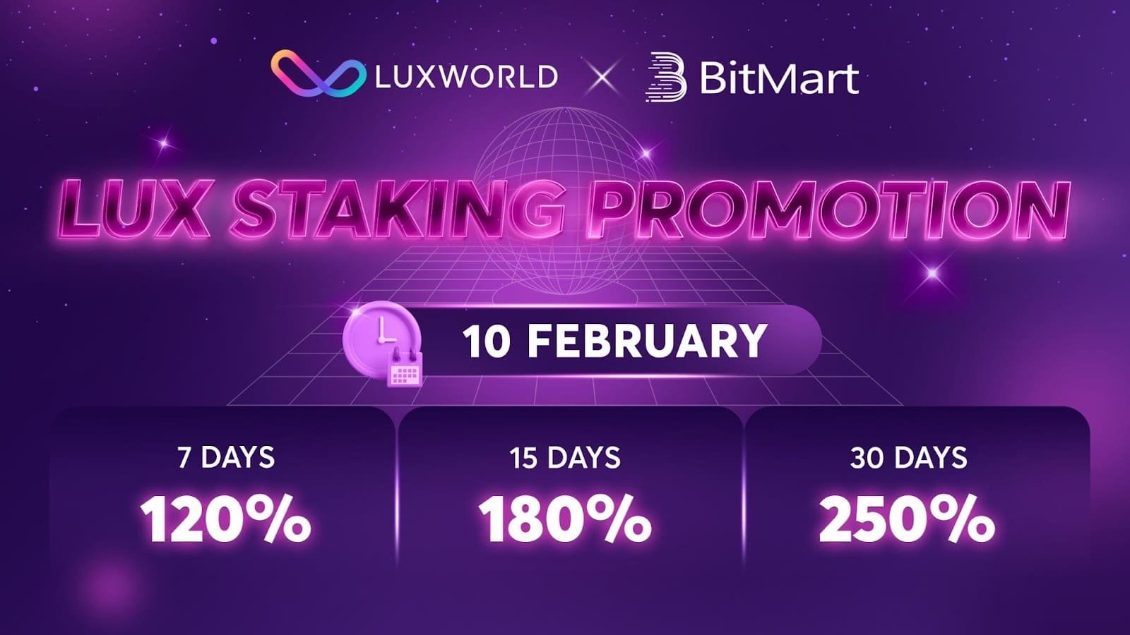 After listing on the Bitmart cryptocurrency exchange, LuxWorld staking is now officially available on BitMart with an interest rate of up to 250%.
