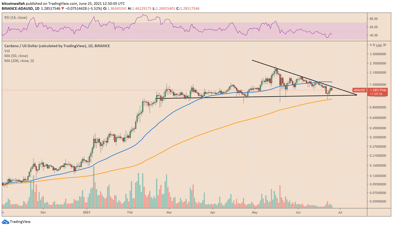 The ADA/USD pair has printed a series of lower highs for almost one and a half months. The coin has stayed firm above the multi-month $1 support. But an absence of significant buying pressure has kept it restricted within a descending triangle setup.