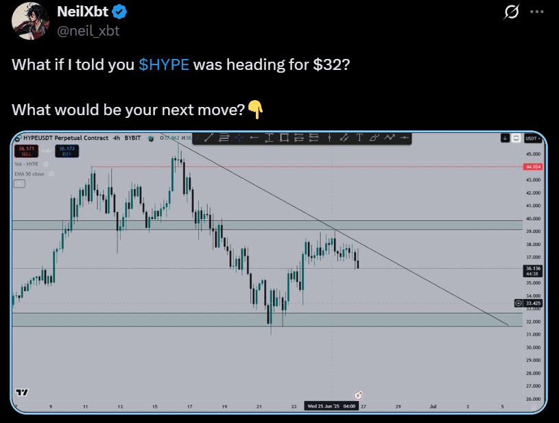 Trader Neilxbt shared a descending resistance trendline on the 4-hour chart, projecting a potential short-term drop toward $32 if the price exceeds the current range.