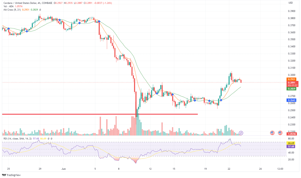 With shorts out of the picture, Cardano continued its rally, gaining another 8% and reclaiming the crucial $0.3 level on June 22nd. Cardano’s price also managed to break above the significant resistance level at $0.2882, making it a support level. Although the bulls were able to cross the $0.3000 market, the bears regained control of the market and pushed the price to $0.295082