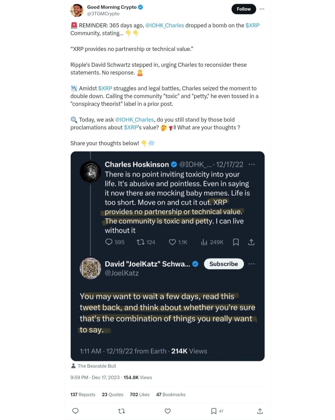 LUCKNOW (CoinChapter.com) — Cardano founder Charles Hoskinson’s past condemnatory statements on XRP and its community have returned to put him in the hot seat. It started when XRP enthusiast X user @3TGMCrypto dredged Hoskinson’s comments from a year ago when he emphatically stated that XRP has no technical or partnership value. Hoskinson also labeled the XRP community “toxic,” “petty,” and spreading conspiracy theories.