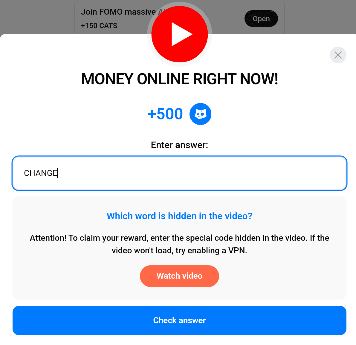 - Claim Your Reward: Enter each code correctly to receive 500 CATS tokens for each, totaling 1,500 tokens.