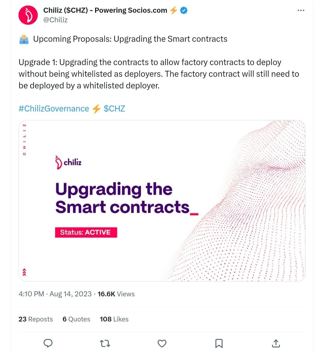 LUCKNOW (CoinChapter.com) — In a recent tweet, Chiliz, the prominent sports blockchain platform, has given a sneak peek into the upcoming upgrades to its smart contracts. The company’s announcement highlighted two significant proposals to improve its smart contracts capabilities.