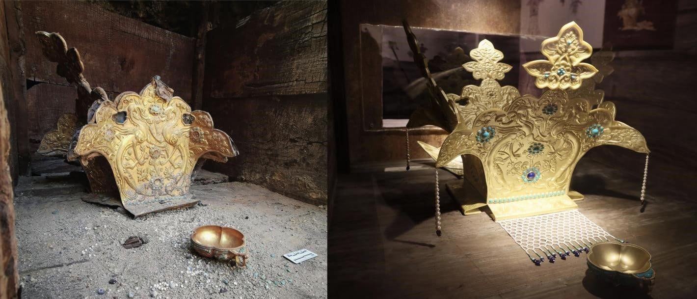 Figure 3. Left: The gilt-silver crown and the gold cup excavated in the tomb; right: The gilt-silver crown and the gold cup made by 3D modeling in the exhibition.