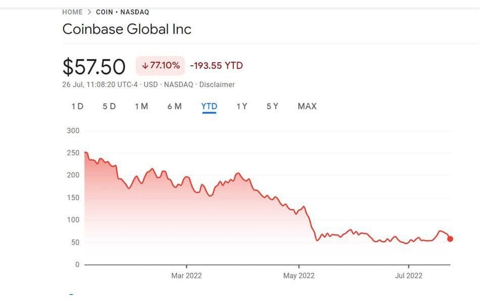 Coinbase stock prices have lost more than 77% of their value year to date, Google Finance charts reveal.