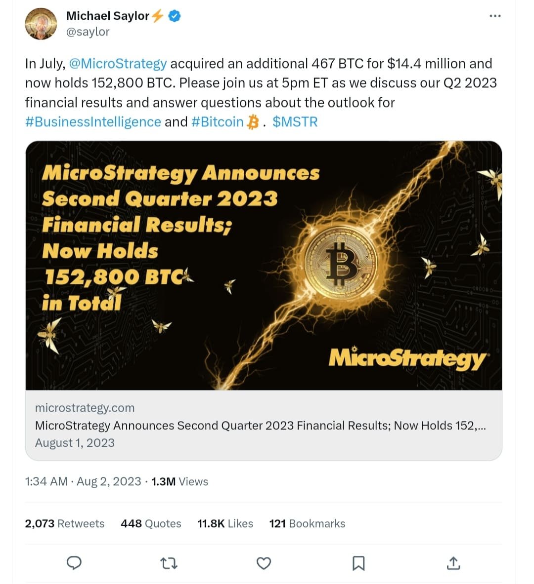 MicroStrategy CFO Andrew Kang said, “Our bitcoin holdings increased to 152,800 bitcoins as of July 31, 2023, with the addition in the second quarter of 12,333 bitcoins being the largest increase in a single quarter since Q2 2021.”