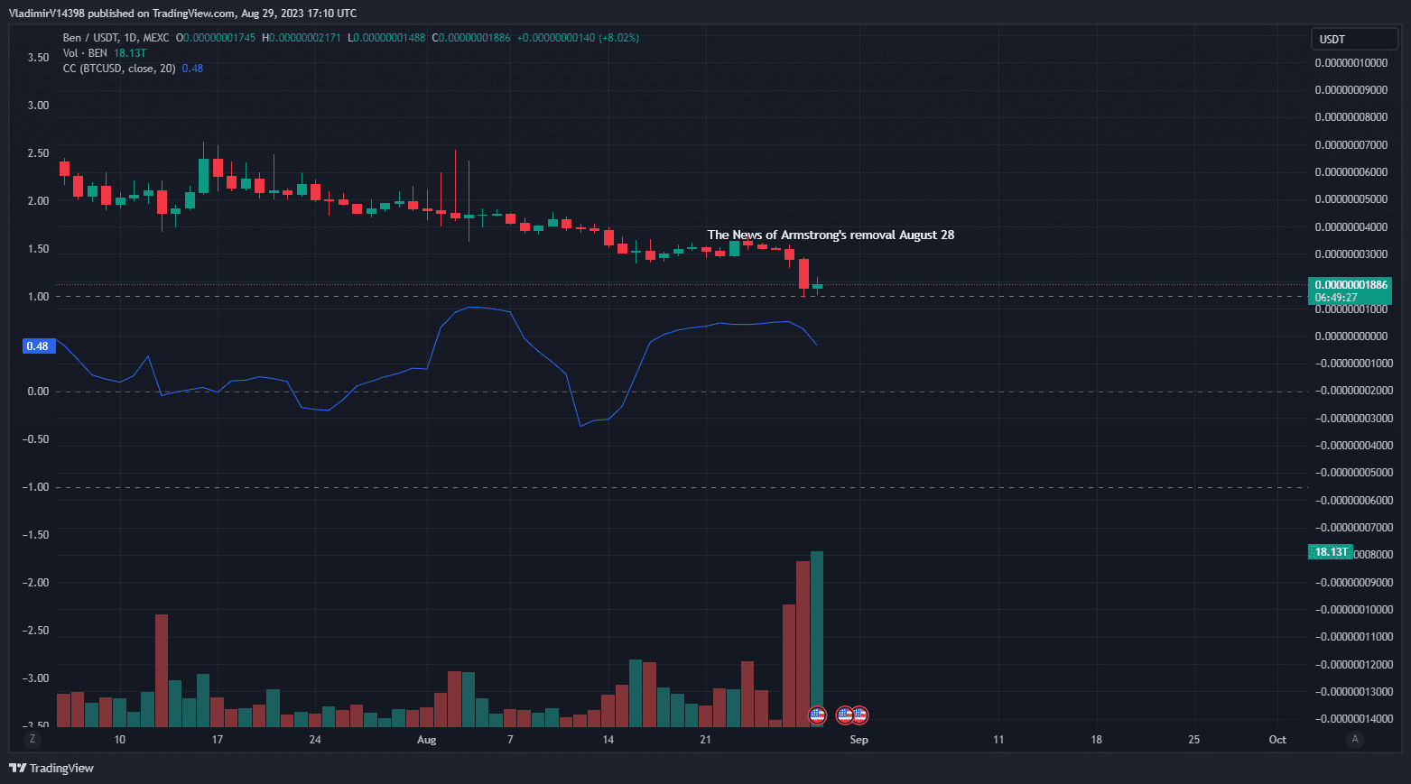 These motions resulted in a nearly 40% price dip over a weekly timeframe. However, on August 29, the BEN coin increased by 6%. Nonetheless, even over a monthly time frame, the BEN coin is down by nearly 60%.