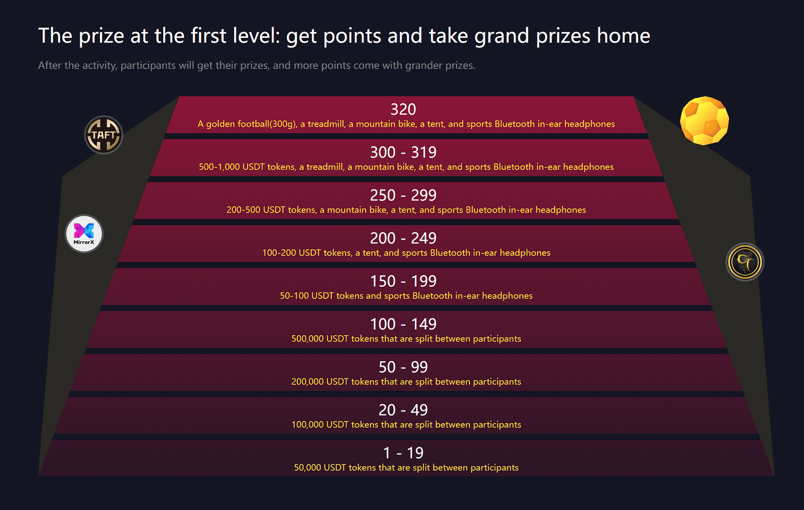According to the official data of CoinW, in this World Cup prediction activity, 1 user gets more than 320 points and won the golden football 300g+treadmill+mountain bike+tent+exercise Headphones jackpot jointly provided by CoinW, and communities of MirrorX MRX, Tafchain TAFT and Create_Meta CT. 5 users get 500-1000 USDT token gift package + treadmill + mountain bike + tent + sports earphones. The physical rewards will be sent to the address of the winners through the inbox letter, please pay attention to the inbox letter in time.