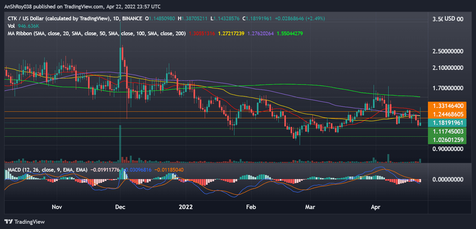 CTK prices jumped more than 21% on Apr 22, between the day’s low ($1.14) and high ($1.387) levels. However, bears swooped in to book profits, paring gains. At present, CTK prices have immediate support near $1.12.