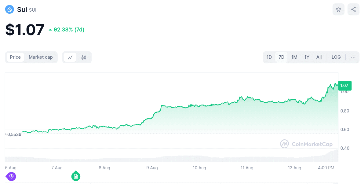 Sui (SUI) is the main cryptocurrency of the SUI blockchain, which is designed for fast transactions and running smart contracts (automated agreements). Sui’s value has more than doubled in the past week, rising by over 92%.