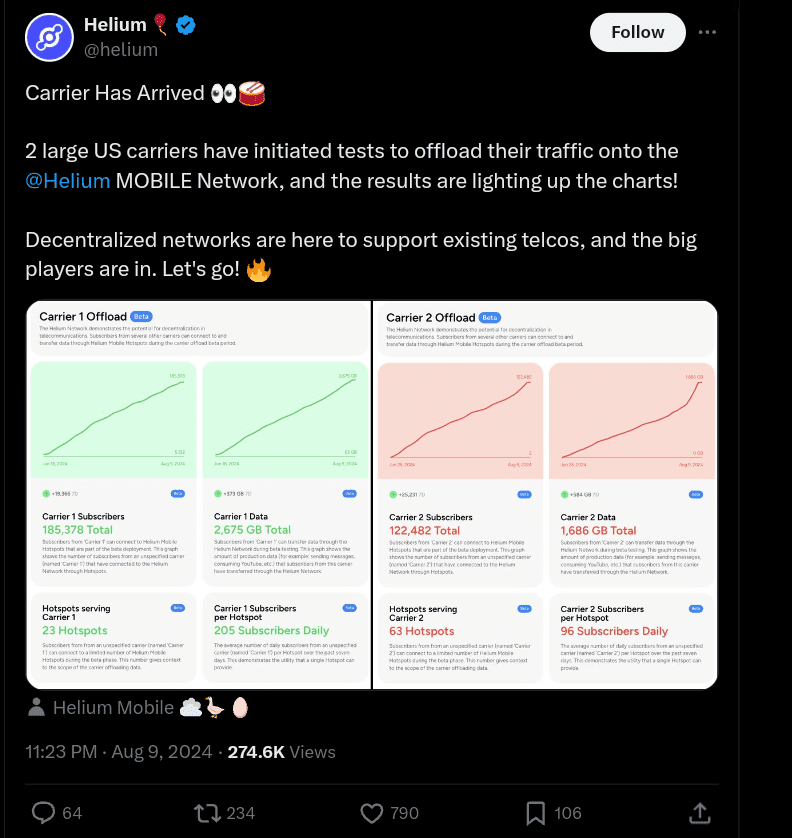 Recently, Helium announced that two major US mobile carriers are testing their network, which is a significant step forward.
