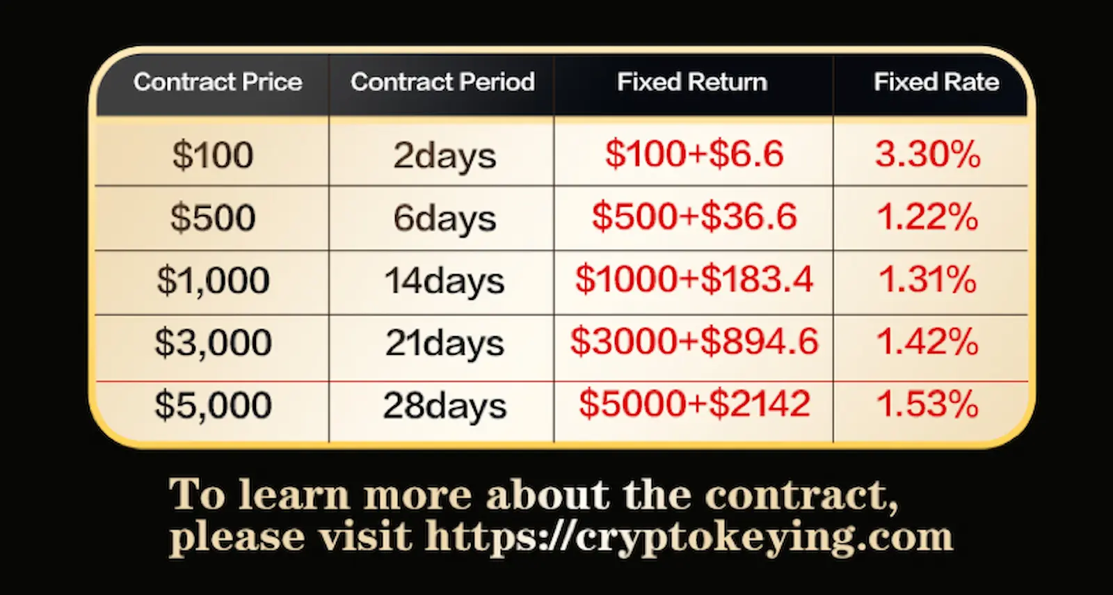 To get started with CryptoKeying, users can visit the official website: cryptokeying.com and register with a valid email address. After signing up and receiving their welcome bonus, users can browse the available cloud mining contracts and select one that matches their investment level and goals. After purchasing a contract, daily earnings are automatically deposited into the user’s account. Withdrawals are processed quickly and free of charge, and users can choose from six supported cryptocurrencies or volatile coins.