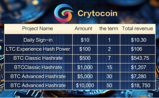 CrytocoinMiner offers a variety of efficient mining contracts: contract prices range from $100 to $10,000, and each package has its own return on investment and a certain contract validity period.