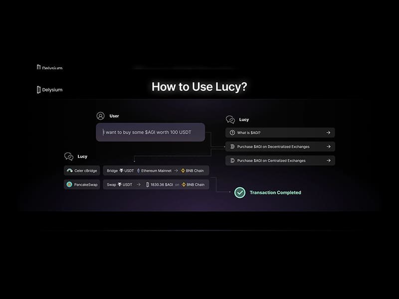 Users can access Lucy using their unique Delysium Agent ID™, ensuring a secure network connection with advanced technologies like account abstraction and ZK encryption. Users interact with Lucy using natural language for an intuitive experience. For example, a user wanting to purchase $100 worth of $AGI can easily do so through Lucy, which gathers necessary information and formulates an efficient workflow. Lucy provides all the essential details, including execution steps and potential fees, allowing the user to make an informed decision.
