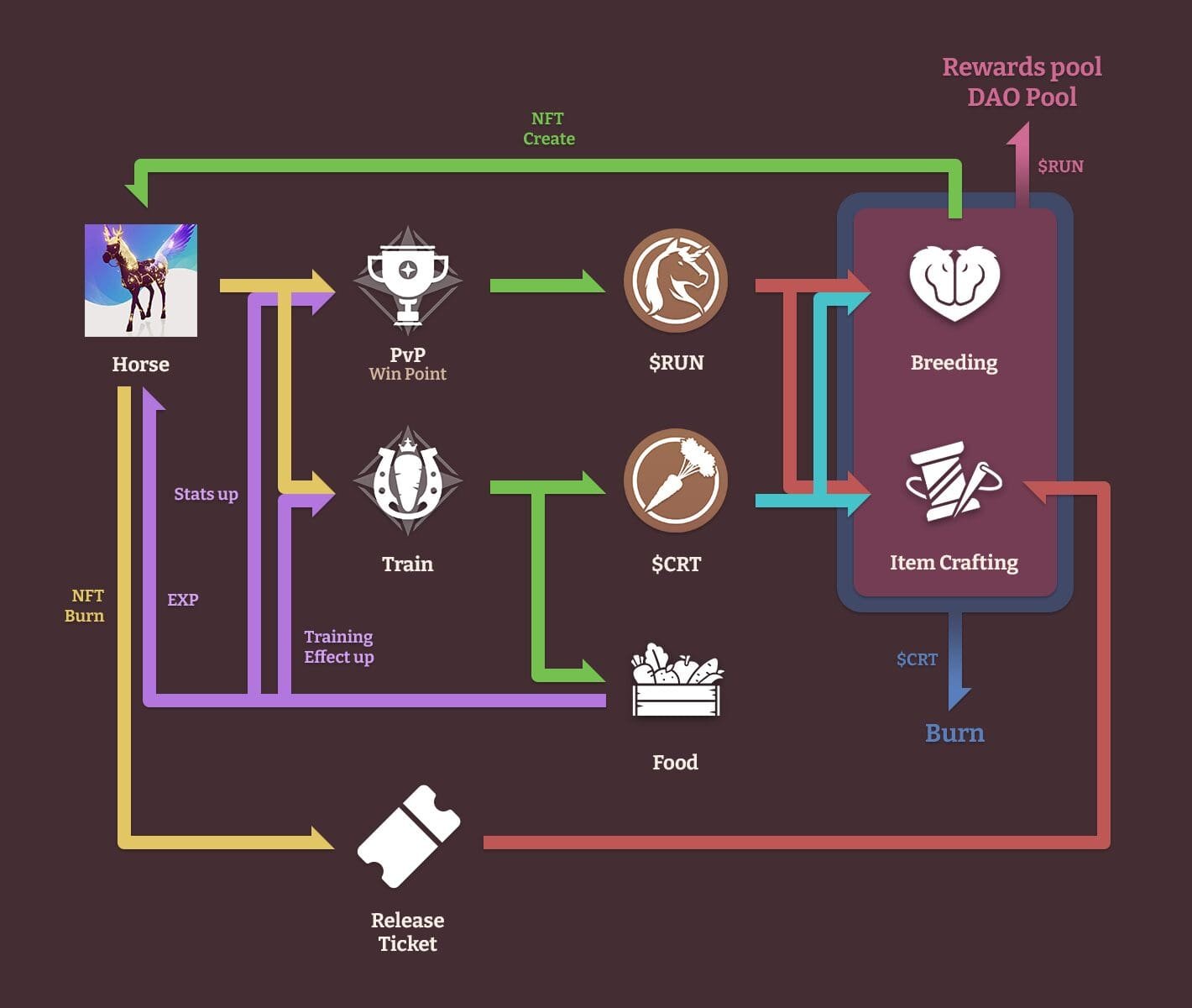 In gameplay, the acquisition of all in-game goods starts with the horses – the non-fungible asset collection of Derby Stars. Players can earn $RUN (governance tokens) by participating in player vs player (PvP) race tournaments using their horses or earn $CRT by participating in training programs. The $RUN tokens earned by players are used for breeding and crafting. All the $RUN tokens utilized in the game are collected into a rewards pool which is later returned to Derby Stars players as rewards for various gameplay and events. One the other hand, players earn $CRT (utility tokens) through training. These tokens can be used for multiple systems in the game and are burned immediately on use. Players can also use $CRT to acquire new horses and items through breeding or crafting. Finally, Derby Stars has a horse release system that allows players to burn their digital horses (i.e., burn NFT tokens) in exchange for other high-quality goods that can be used in PvP races and training, along with a chance to acquire rare horses. These burn mechanics allows the Derby Team to control inflation and to maintain the value of horses. The illustration below explains the Derby Stars gameplay: