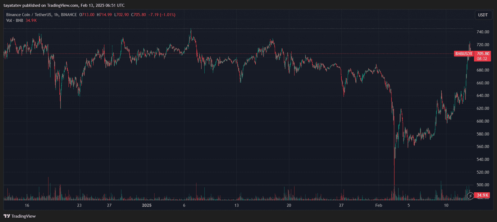 Binance Coin (BNB) surged past $710, briefly hitting $720, before settling around $705.80, as shown in the latest BNB/USDT trading chart. The increase came after the launch of the MyShell Initial DEX Offering (IDO) on Binance Wallet. The IDO allowed users to subscribe using BNB, with a cap of three BNB per user.