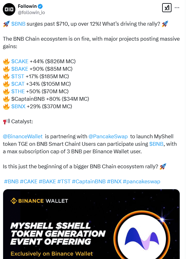 BNB Surges Amid MyShell IDO. Source: @followin_io