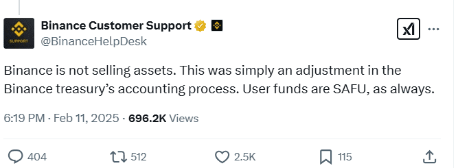 Binance, however, refuted these claims. The exchange’s X account clarified that the changes stem from internal treasury management, not an asset sell-off. Binance insists that these funds were not customer assets but part of an accounting reallocation.