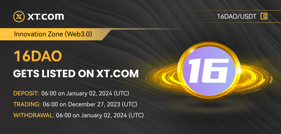 December 28th , 2023 , XT.COM, the world’s first socially infused trading platform, is thrilled to announce the listing of 16DAO Token on its platform in the innovation zone (DeFi) and the 16DAO/USDT trading pair has been open for trading at 2023-11-27 6:00 (UTC).