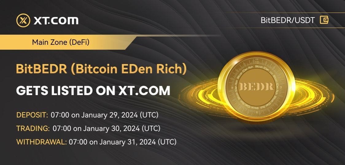 XT.COM, the world’s first socially infused trading platform, is thrilled to announce the listing of BitBEDR(Bitcoin EDen Rich) on its platform in the Innovation zone (DeFi) and the BitBEDR/USDT trading pair started from 2024-01-30 16:00 (UTC).