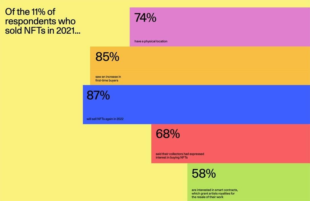 An Artsy Gallery Insights report suggests NFT adoption in the sector was slow in 2021. However, 87% of those galleries that sold NFTs said they were ready to do it again, citing customer demand.