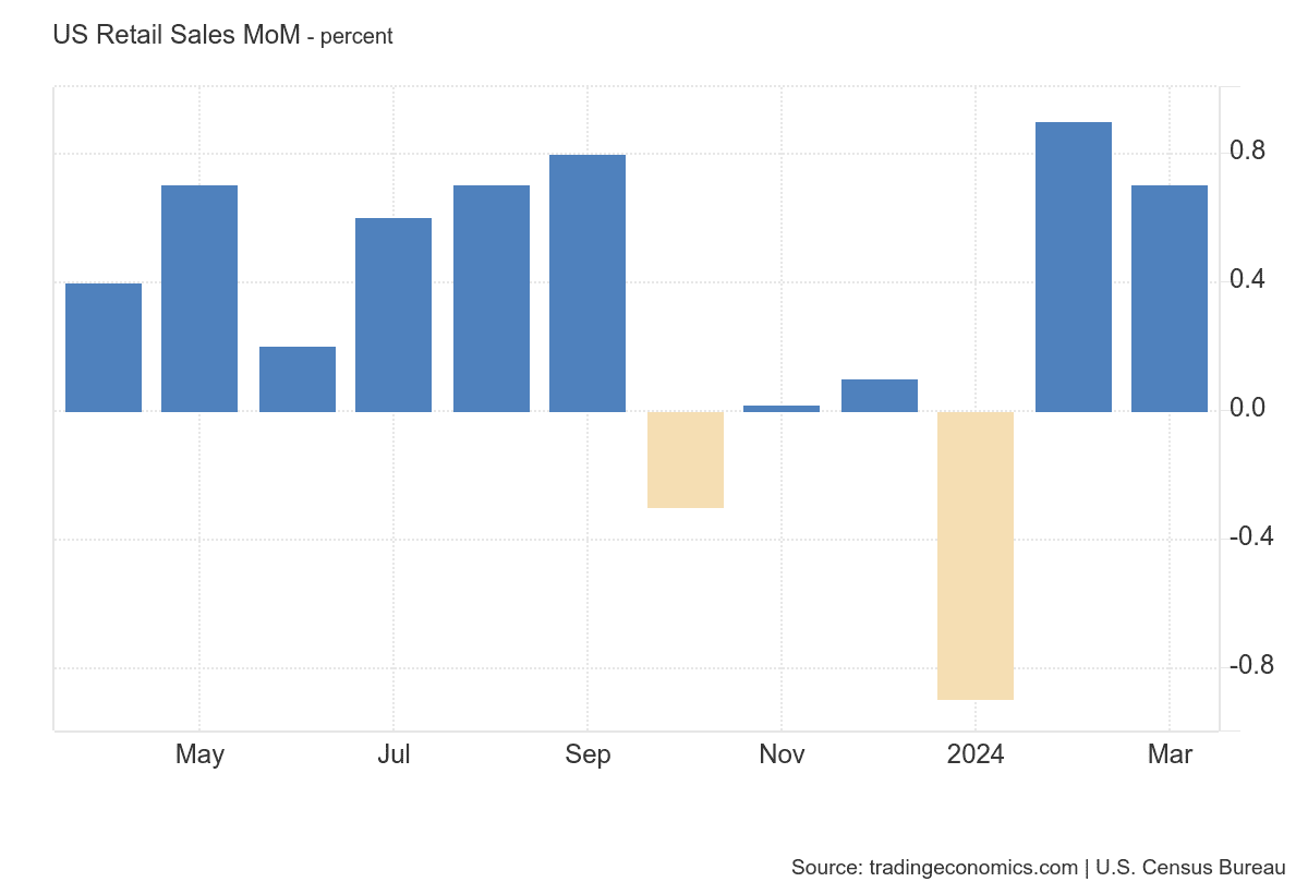 In March 2024, U.S. retail sales increased by 0.7% month-over-month, eclipsing the 0.3% forecast and signaling continued consumer confidence. This follows February’s revised rise of 0.9%. The data, showcasing strength in eight out of thirteen categories, suggests a sustained momentum in consumer spending.