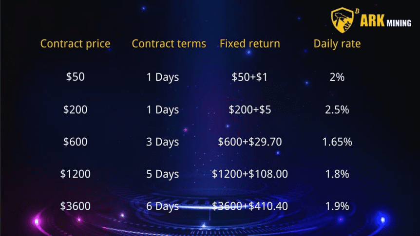 To earn passive income through cloud mining on ARK Mining, just sign up and buy a contract. You don’t need to invest in additional equipment or have technical expertise, just rent a mining rig and earn daily passive income. Our platform provides a simple and hassle-free way to start cryptocurrency mining. Currently, ARKMining offers various cloud mining package options: