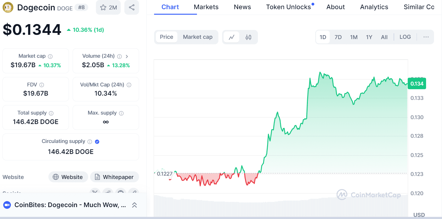 NAIROBI (CoinChapter.com) — On Oct. 18, Dogecoin (DOGE) surged after Elon Musk, Tesla CEO and owner of X, endorsed Donald Trump at a town hall event in Pennsylvania. Musk also proposed a new government agency called the “Department of Government Efficiency” (D.O.G.E.), referencing the popular meme cryptocurrency. His remarks triggered a price spike in Dogecoin, with the meme coin jumping by more than 10%.