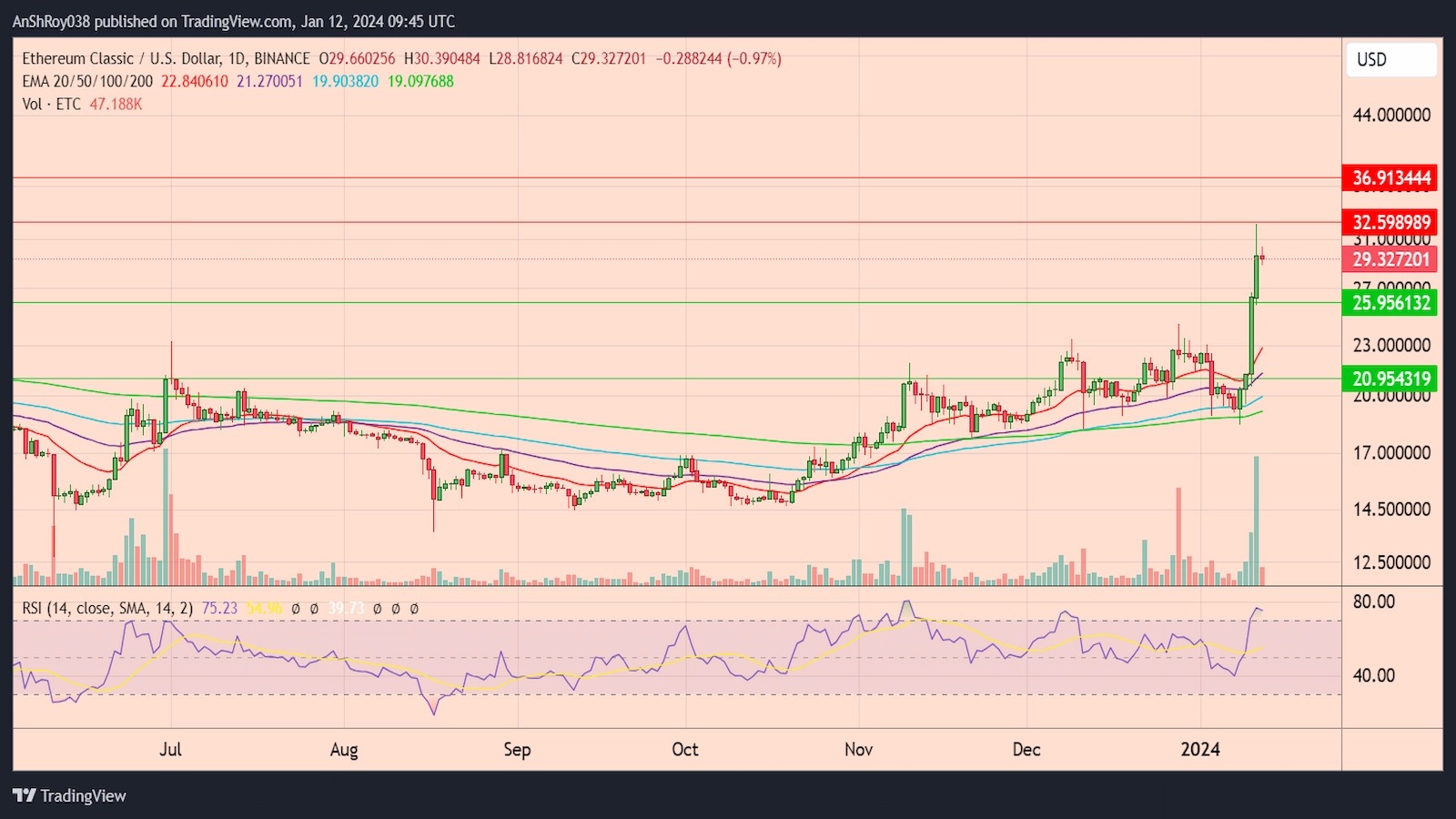 NEW DELHI (CoinChapter.com) — Ethereum Classic (ETC) has been on a bull run since Jan. 8, which has helped ETC price paint a 76.25% spike from Jan. 8’s low near $18.39.