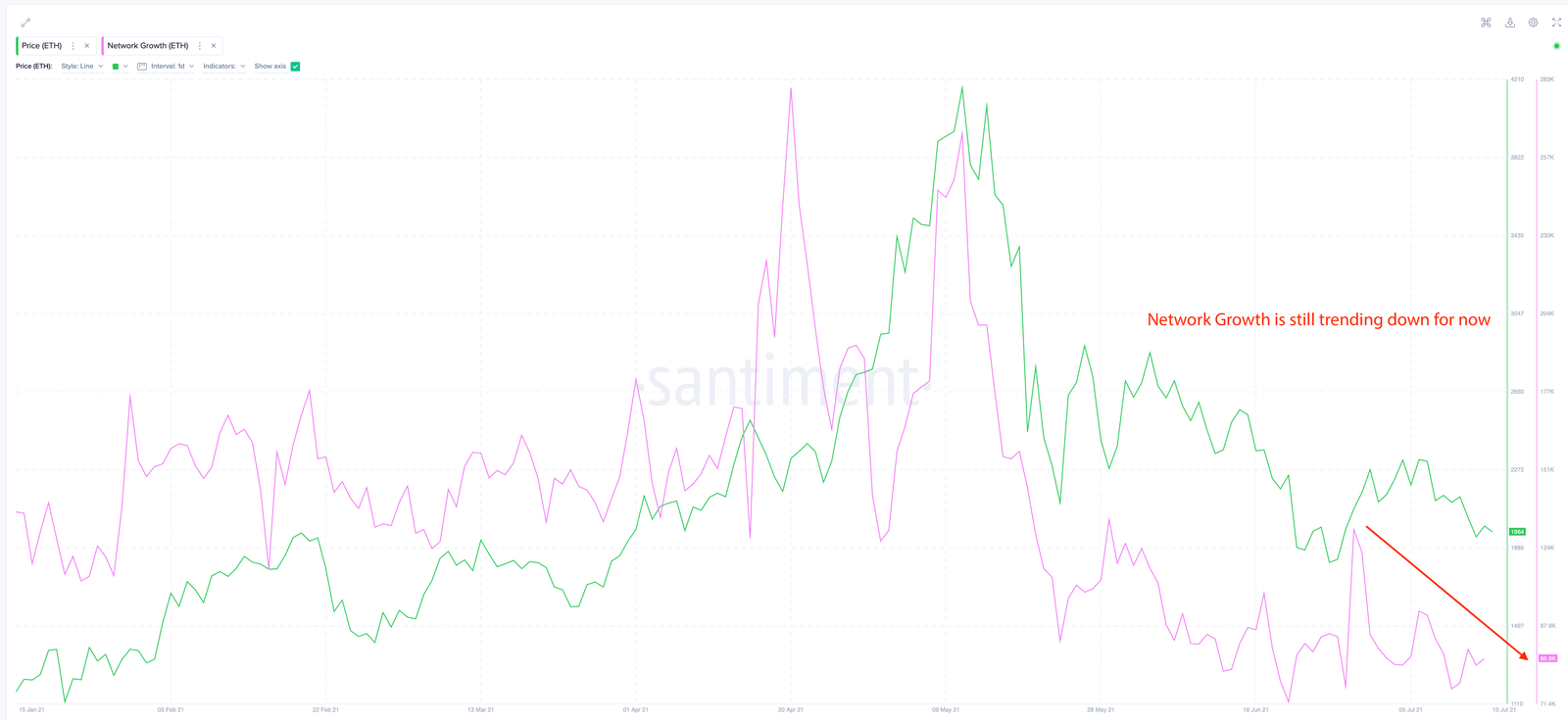 As per Santiment’s observations, despite ETH’s price decline, daily active addresses (DAA) on the Ethereum network have remained consistent since the beginning of the year. However, network growth has hit a snag.
