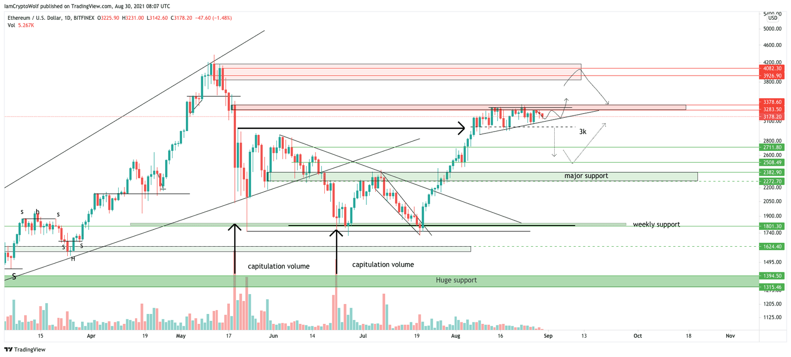 They also pointed out that the significant support bar in June is far behind, and the trading volume is way down, which signifies that “we got rid of short-term speculators.” During the past two weeks, Ethereum has been battling against the resistance area near $3,368.
