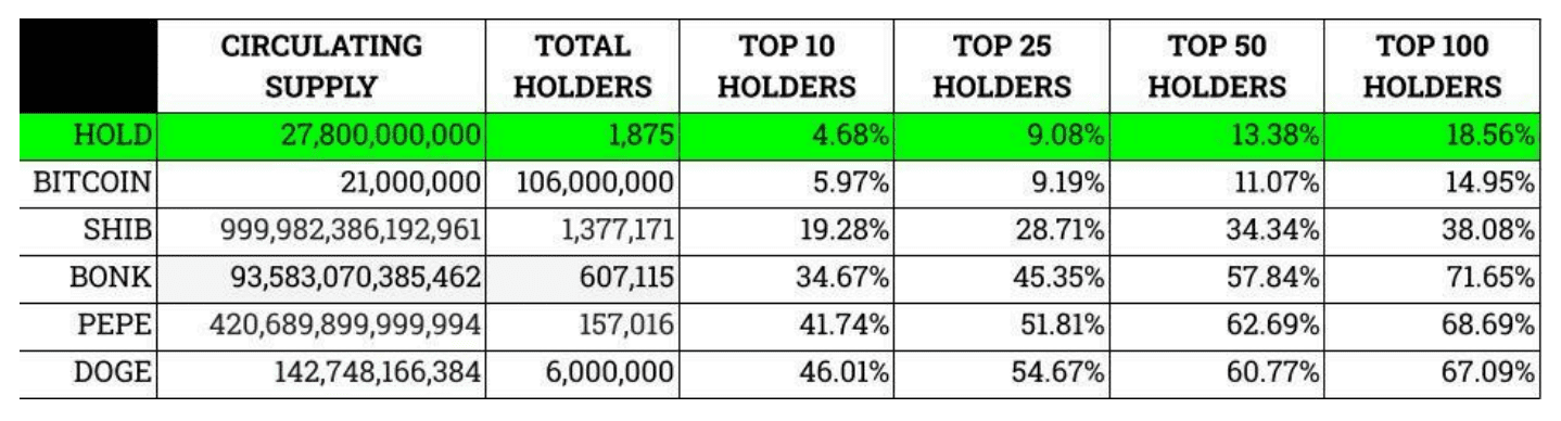 Enter HOLD! Created with this problem in mind, the dev wanted to create a project that was truly equitable for EVERYONE and not just a select few. HOLD was stealth-launched in September 2023, only allowing 0.01% max wallets. A limitation which doubled every hour ensuring that not one holder could acquire more than 1%. Initial taxes were 3/3 eventually reducing each week until 0/0. These taxes were used to buy back and burn 72.1% of the total supply. This approach taken by the dev had never been done previously. What would follow is the strongest distribution in crypto, even better than the famed Bitcoin (BTC)! This would be very difficult to recreate because if a community knew that this was going to launch in this manner, they would find ways to get ahead of it. So, in many cases, HOLD is the first and only project to accomplish this very desirable and unique accolade!