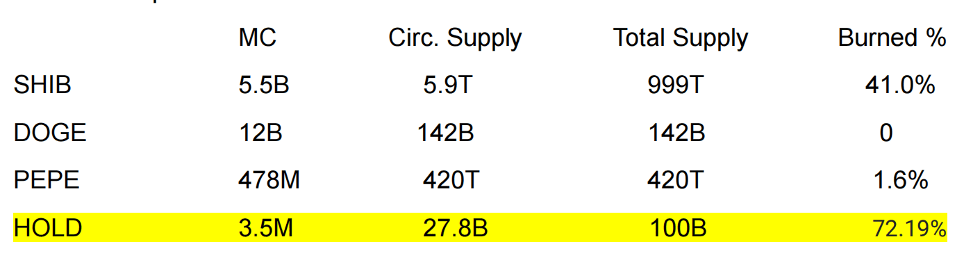 PEPE pumped to $1.6B MC and SHIB pumped to 36B MC with monstrously large supplies! HOLD supply will always remain significantly lower and fixed! Thus HOLD MC has significantly more possible upside ROI.