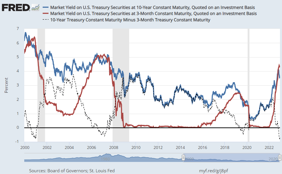 When the 3-month treasury yield becomes higher than the 10-year treasury yield, as seen on the chart below, the yield curve is said to be ‘inverted.’ This occurrence predicted the last 10 recessions.
