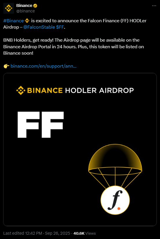 Binance has picked Falcon Finance (FF) as its 46th HODLer Airdrops project, allocating 150M FF to BNB holders subscribed to Simple Earn (Flexible/Locked) or On-Chain Yields between Sept. 14–16, 2025.