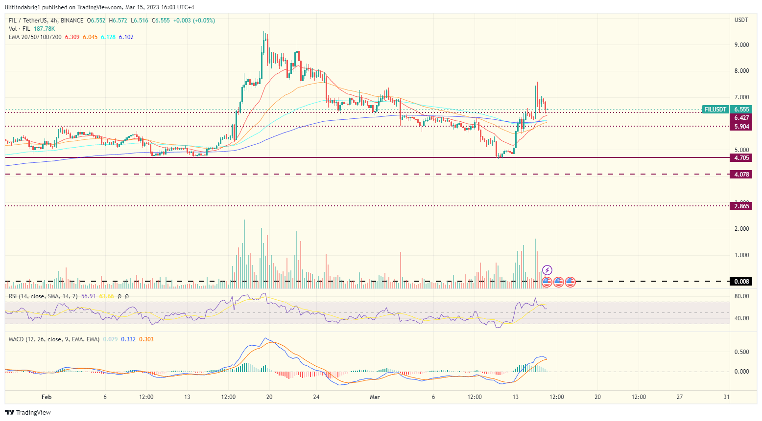 YEREVAN (CoinChapter.com) – Filecoin price dropped 15% on March 15 after a 54% advance on March 12-14. As a result, the FIL/USDT exchange rate stood at $6.45 in the European session. Moreover, the token price could drop by another 10% by Sunday, March 19.